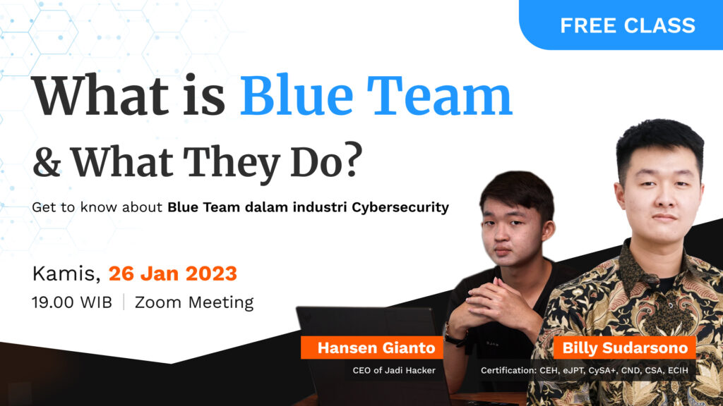 Pada Free Class kali ini kalian akan mempelajari tentang Blue Team dalam Cybersecurity secara basic dan general. Mulai dari apa yang dipelajari didalam Blue Team, sampai apa saja yang mereka lakukan untuk mendapatkan gaji besar.Kalian bisa dapatkan jawabanya dalam sesi webinar bersama Instructor Billy Sudarsono dan Hansen Gianto. Free Class ini cocok untuk kalian yang masih ragu terjun ke bidang cybersecurity di dunia profesional.Jadi, tunggu apalagi yuk daftar kelasnya sekarang!.